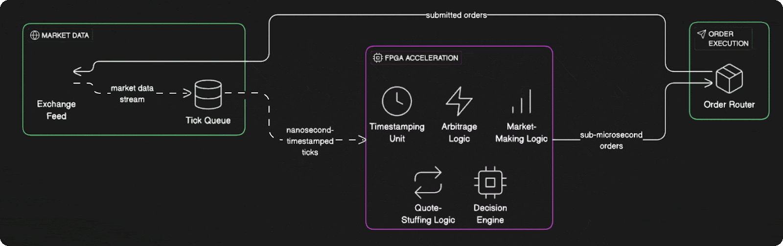 When market data arrives at an FPGA, there's no operating system overhead, no software stack, no uncertain execution time. The logic is literally wired into the hardware.