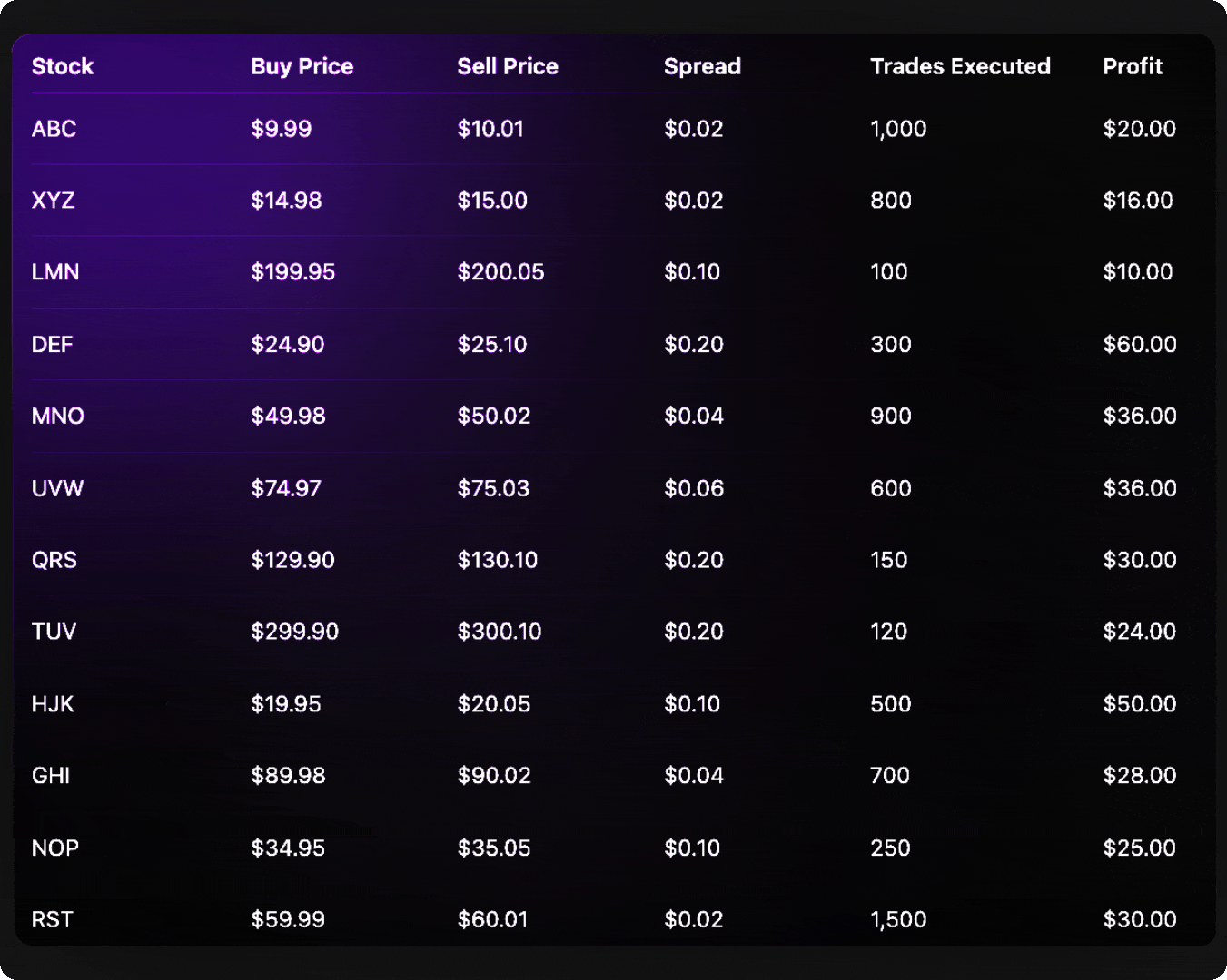 Consider a market-making strategy—one of the most common HFT approaches. You're essentially acting as a middleman, continuously offering to buy stocks at $9.99 and sell them at $10.01. When someone accepts your sell order, you've earned a $0.02 spread. Multiply this by thousands of stocks and thousands of transactions per second, and those pennies add up to significant profits.