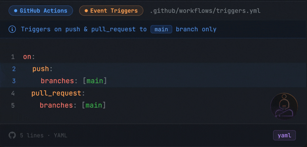 This runs CI only when code touches main, either through a direct push or a pull request targeting it. You can also trigger on tags, scheduled cron jobs, or manual dispatch.