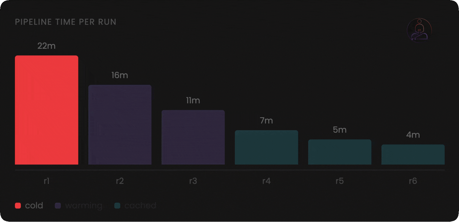 For teams with large images and complex multi-stage builds, the result is pipelines where the actual test execution is a fraction of the total run time. Most of the time is reconstruction: reinstalling dependencies, pulling the same base images, rebuilding layers that have not changed in days. The code changed. The pipeline acts like nothing did.