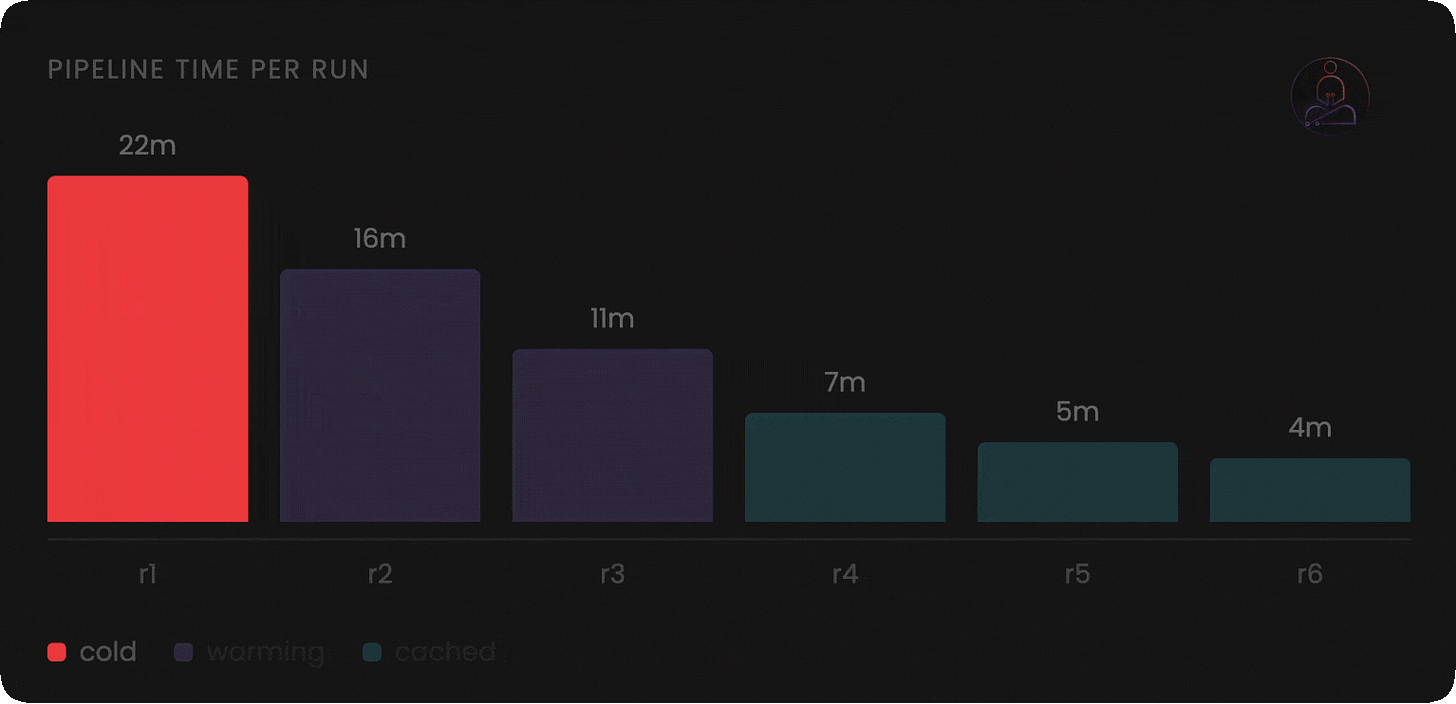 When the run starts, it installs your dependencies from scratch. It pulls your Docker base image from a registry. It initializes your build tools. It does all of this even if the exact same work was done an hour ago and nothing relevant changed.