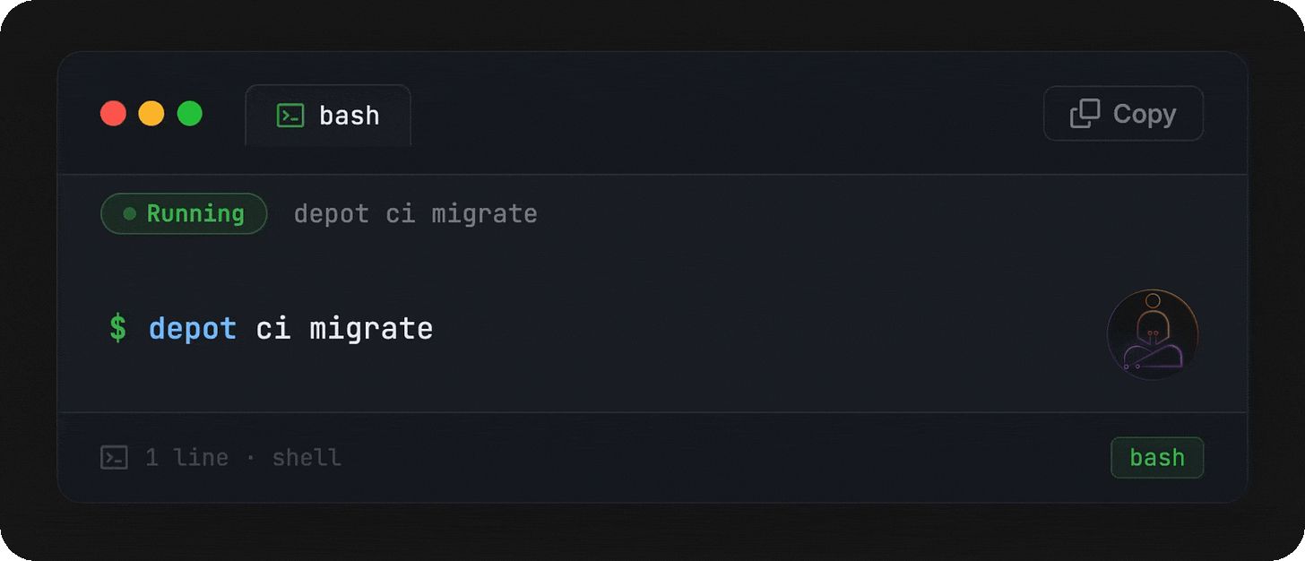 Depot CI, which launches on March 24th, is built around this architecture. Their compute layer is persistent. An orchestrator called Switchyard sits on top and handles scheduling and isolation. GitHub Actions YAML is the first supported workflow format, and migration is straightforward: move your workflows from a .github folder into a .depot folder. Your existing pipeline definitions work as shown.