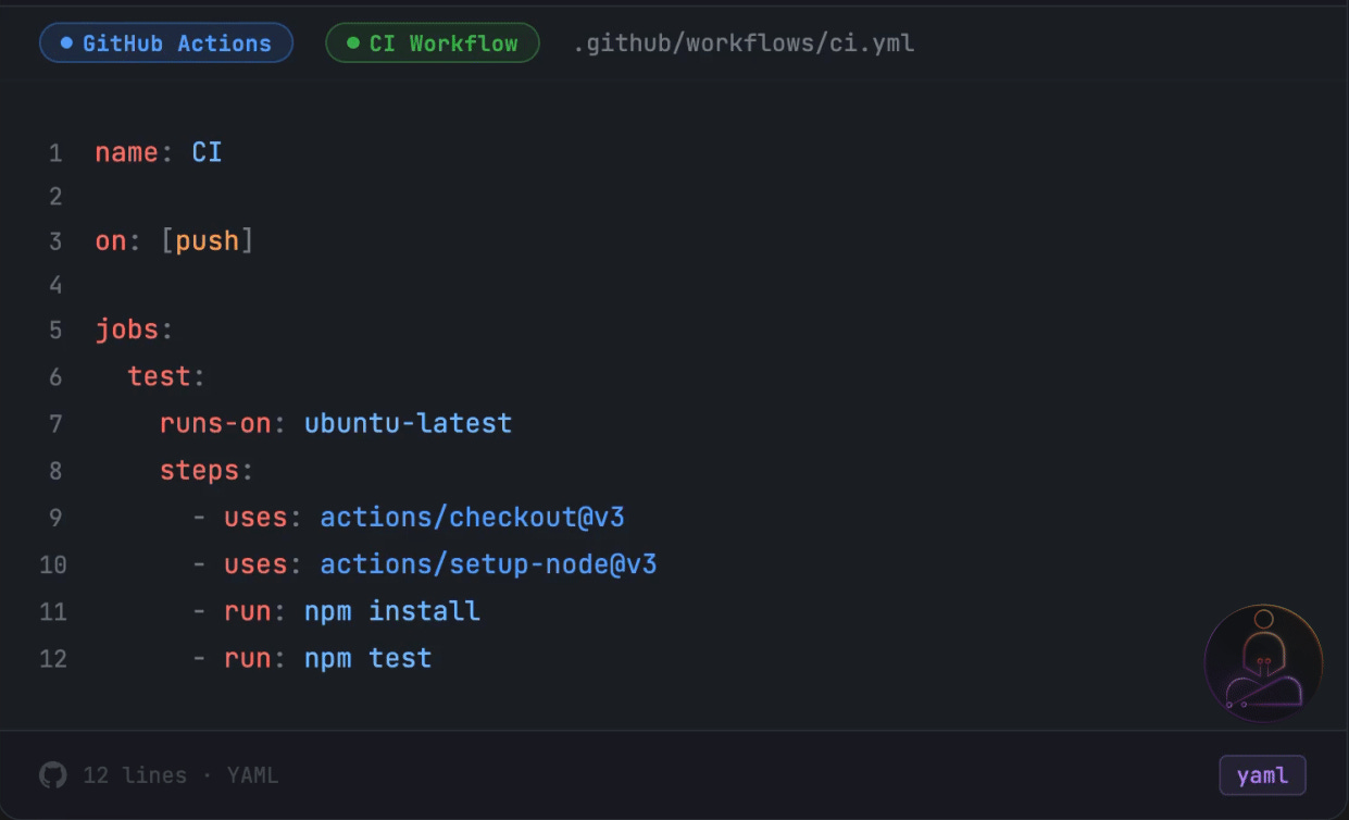 Four things are happening here. The on: block defines the trigger. The jobs: block defines what to run. The runs-on: tells GitHub what kind of machine to provision. And steps: is the actual sequence of commands.