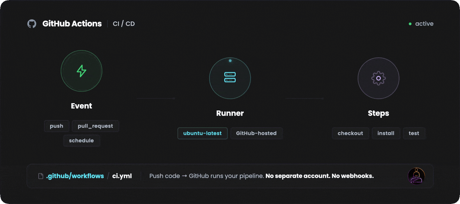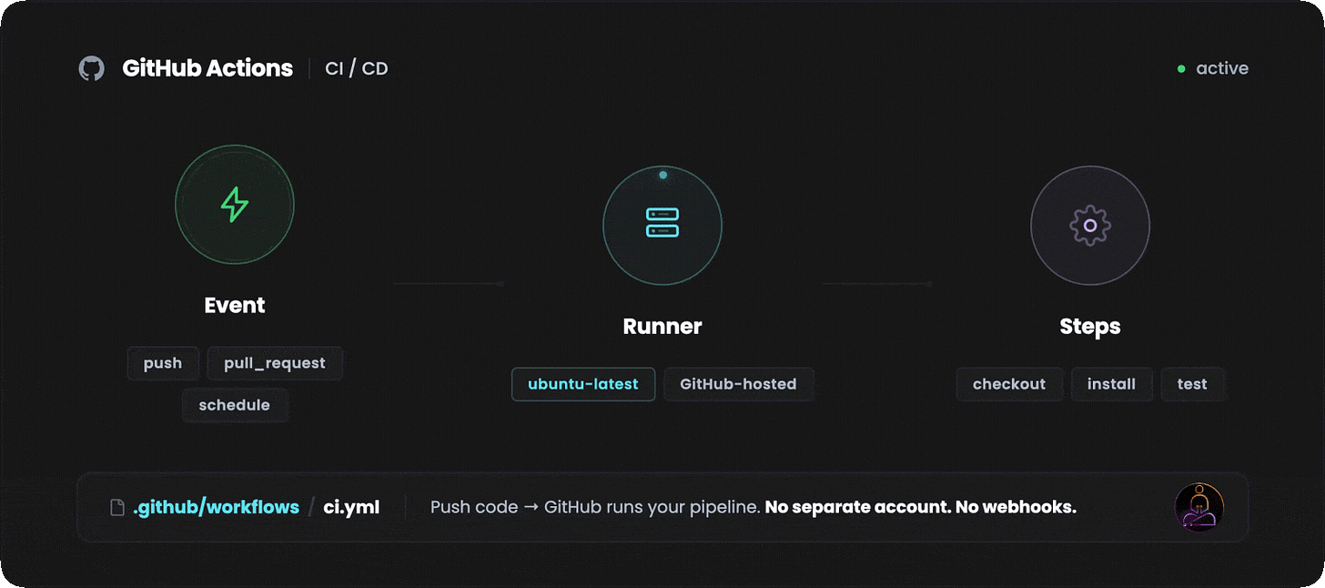 No separate account. No webhook configuration. No third-party integration to maintain. You push code to GitHub, and GitHub runs your pipeline.