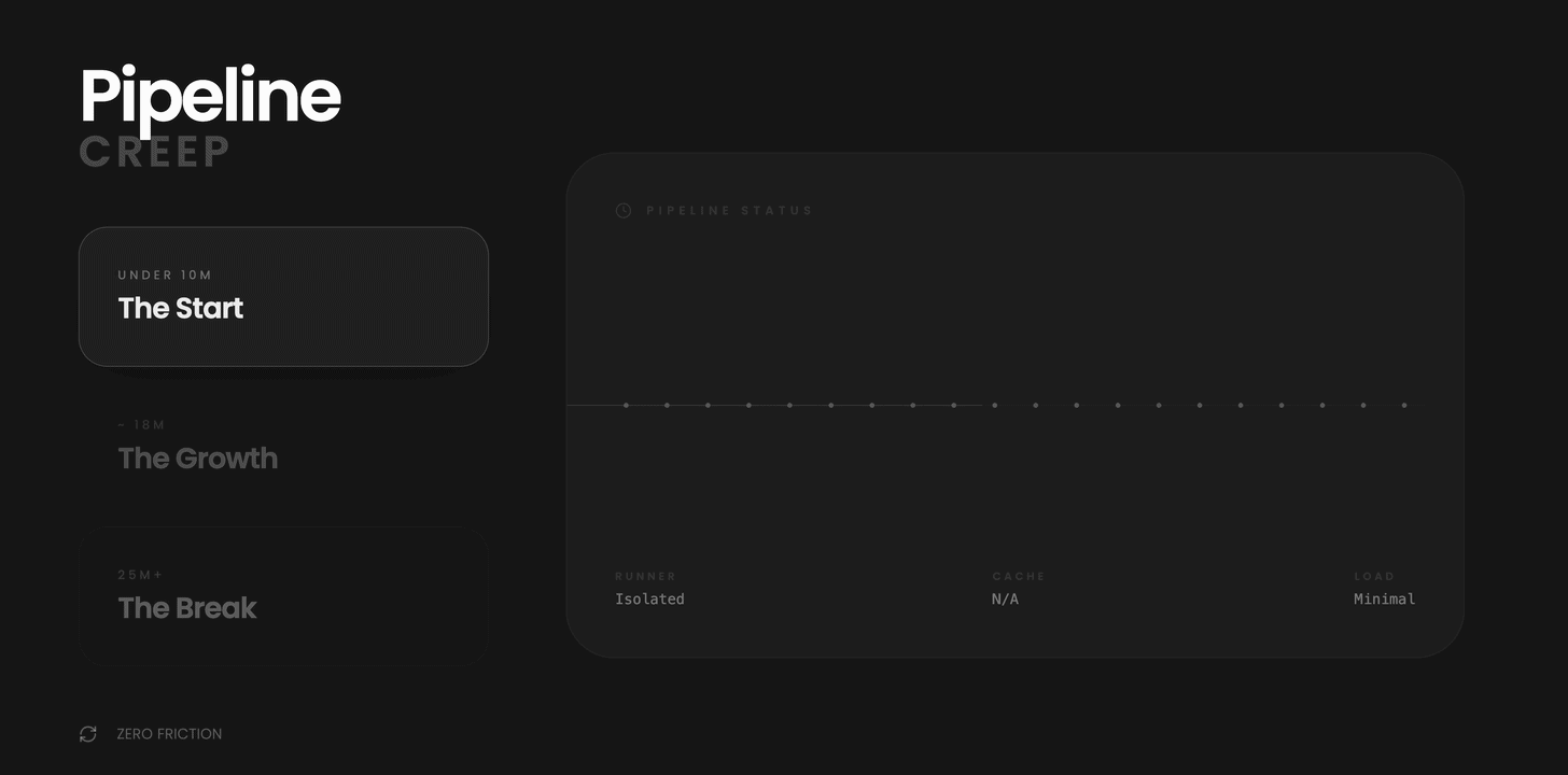 Most teams start with a pipeline that looks something like what we just covered. A few jobs, a handful of steps, done in under 10 minutes. It works well and there is no reason to think about it too deeply.