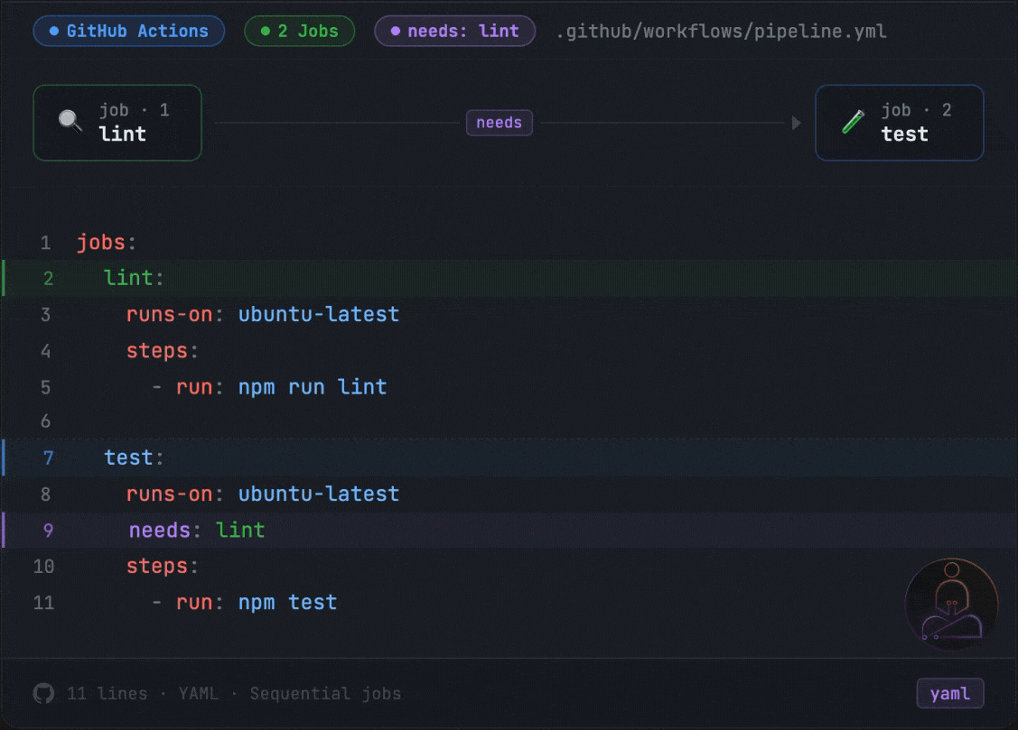 Here test will not start until lint finishes. If lint fails, test never runs. This is a small detail that has a big effect on how you design your pipeline.
