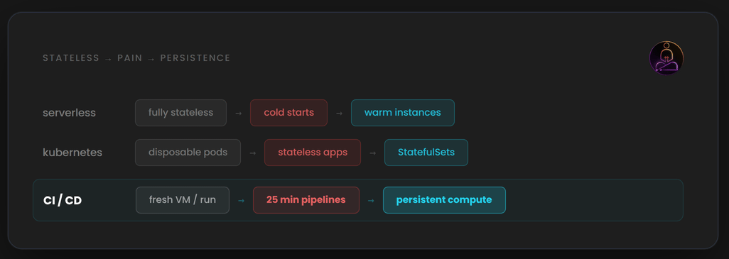 CI is going through the same evolution. The stateless runner model solved real problems when it was introduced. Reproducible builds. Strong isolation. No operational overhead.