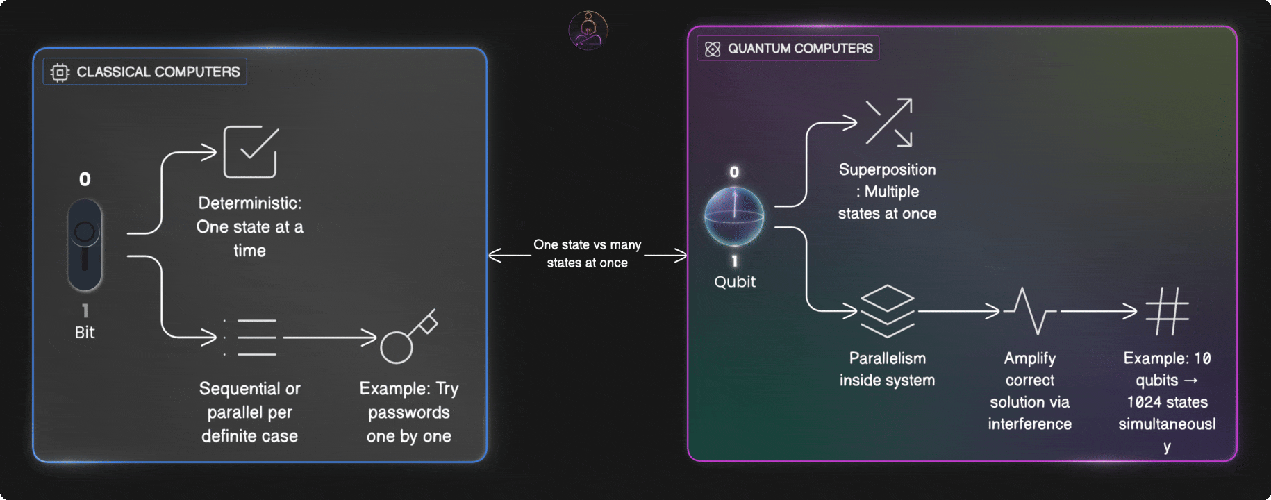 Regular computers operate step by step. Each bit stores exactly one value. If you need to test multiple possibilities, like trying different passwords or searching a huge database, you check them one at a time. Sure, you can split the work across multiple cores, but each core is still looking at individual cases. The basic process is sequential.