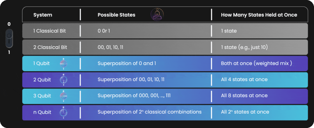 One qubit changes everything. It exists in a superposition of 0 and 1 at the same time. Two qubits can represent all four combinations at once. Three qubits hold eight states simultaneously.