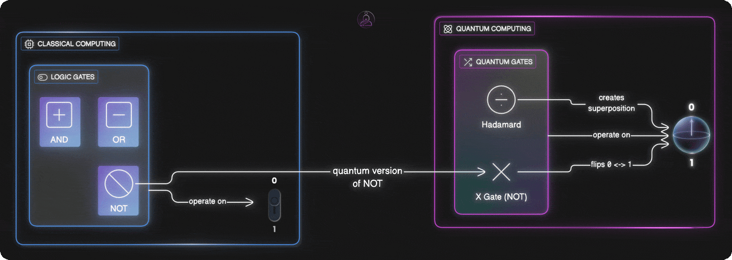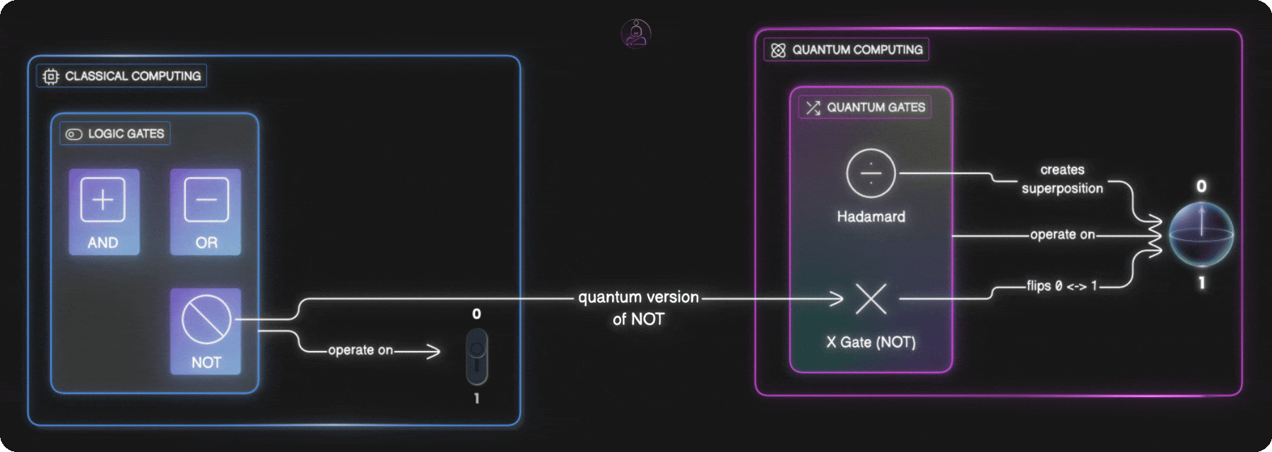 Just as regular computers use logic gates (AND, OR, NOT) to work with bits, quantum computers use quantum gates to work with qubits. But instead of flipping between definite values, quantum gates rotate qubits around the Bloch sphere, changing their probabilities.
