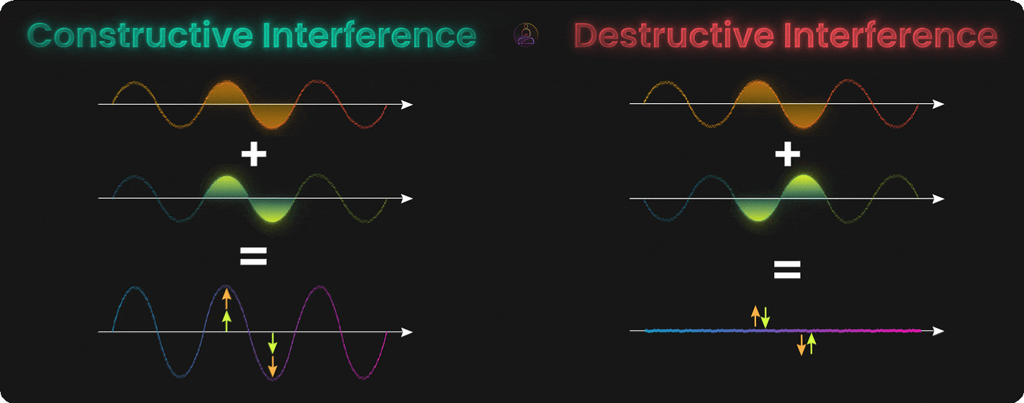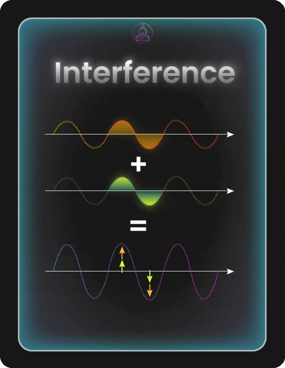 Think of interference like ripples on a pond. When two ripples meet, sometimes they add up to make a bigger wave (constructive interference). Sometimes they cancel each other out and leave flat water (destructive interference).